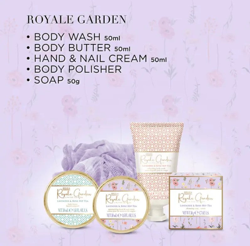 Set de regalo Royale Garden. El conjunto comprende un gel de lavado corporal de 50ml, mantequilla corporal de 50ml, 50ml de crema para manos y uñas, 50g de jabón y un pulidor corporal. Todo lo que necesita para una lujosa experiencia de spa en casa.