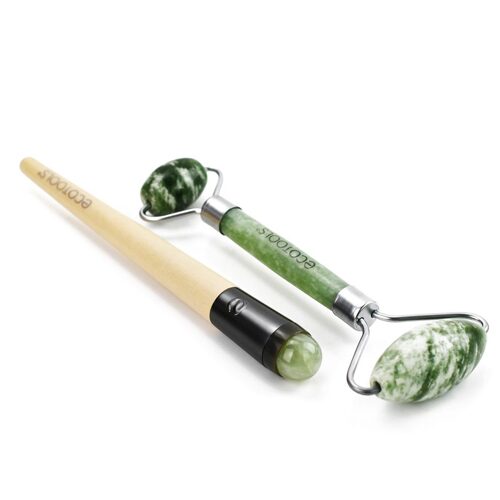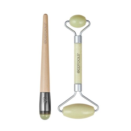 El jade roller duo está hecho con jade 100% puro, diseñado para la mejor experiencia de spa en casa, ayuda a reducir la inflamación, enrojecimiento y suaviza la piel. Incluye: rodillo de jade y rodillo para debajo de los ojos. Comienza usando el rodillo de jade suavemente en la barbilla hasta la línea del cabello. Continúa este movimiento por el resto de la cara y el cuello con tu crema hidratante favorita. Usar rodillo para debajo de los ojos, con su crema favorita, para recorrer suavemente comenzando en la esquina interna del ojo. Tip de spa: dejar en refrigerador para usar frio o calentar para abrir los poros