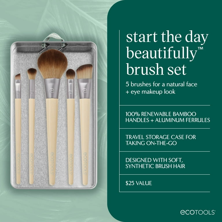 El kit EcoTools Start the Day Beautiful está diseñado con las herramientas de maquillaje para simplificar tu rutina diaria de belleza y organizar su espacio de belleza. Este kit incluye una colección básica de 5 pinceles esenciales, 3 tarjetas de belleza y una bandeja de almacenamiento.